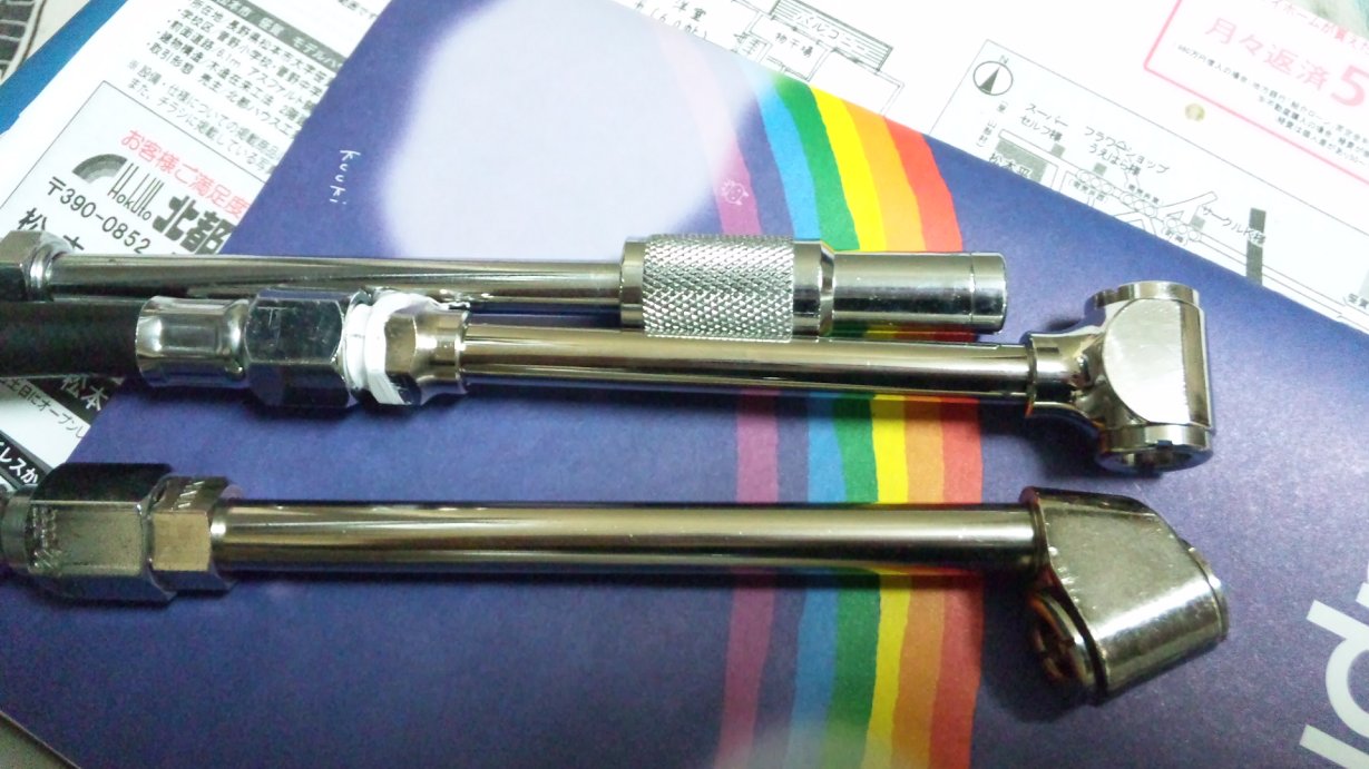 CUB(日本の4メーカー製のバイク)だとエアバルブがセンターに直立してるパターンなので、コレでは作業になりません。